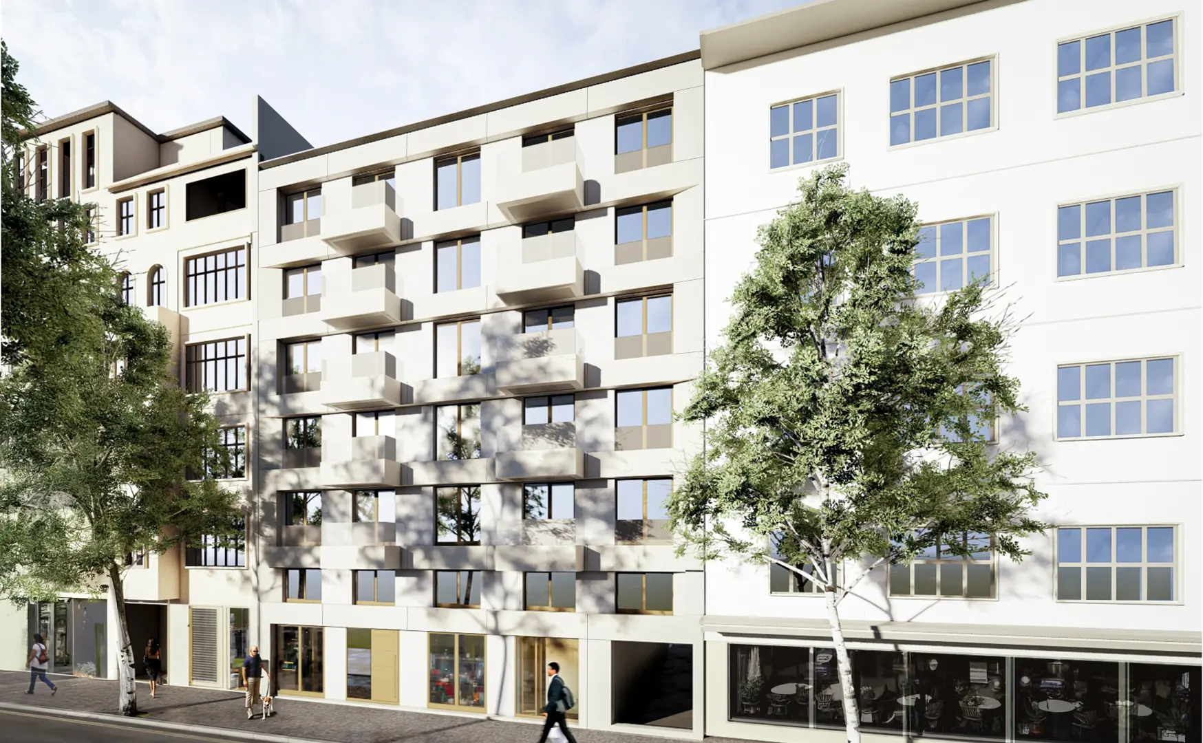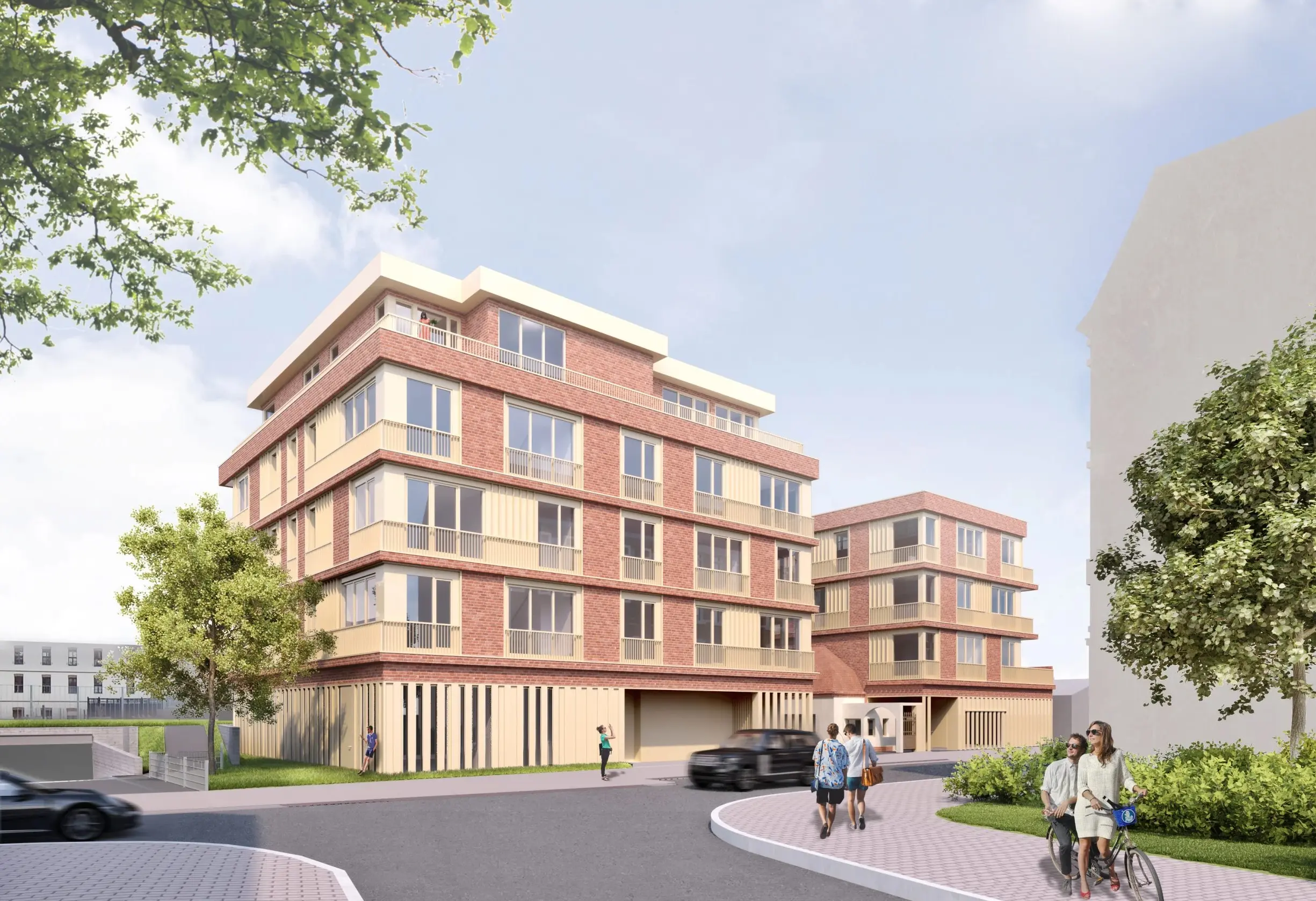 An der Angerstraße sollen zwei Wohnhäuser entstehen. Haus 1 ist ein geplanter Neubau mit fünf Geschossen. Im Erdgeschoss sowie in den darüberliegenden Etagen sollen 15 Wohnungen entstehen. Haus 2 besteht aus vier Geschossen. Der denkmalgeschützte Erdgeschossbereich wird saniert und um einen aufbauenden Neubauanteil ergänzt. Im Erdgeschoss sind die Garagenstellplätze sowie eine kleine Gewerbeeinheit vorgesehen; darüberliegend werden sieben Wohnungen entstehen.